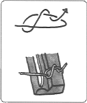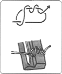 @ブリッジに弦を結ぶ ガット弦には普通はボール・エンドが付いていないので,ブリッジに弦を結び付けて使うんだ。 まずネック側からブリッジの穴に弦を通し,先を前側に戻して弦の下を通し,後ろに2〜3回巻き付ける。 先端は少し長めに出しておいて,弦を張り終わってから切る方がきれいにいくよ。 |