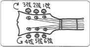 Bペグに弦を巻く ペグにはポスト(弦を巻く部分)に横穴があいたタイプが多いんだ。 もし縦穴式のペグが付いている場合は「フェンダー・タイプのペグ」を見てくれ。 弦を巻こうとするポストの1つ半から2つ先(1,2弦は緩みやすいので2つ先)のポストの位置で 折り曲げて,その先を横穴に入れてペグを巻き上げる。横穴から出た弦の先は, 巻かれている弦の1段目2段目の間に入れると,緩みが発生しにくいよ。 巻く時ポストは反時計回りに回る。逆に巻かないようにね。 弦がブリッジ部,ナット部などで正しい位置を通るように気を付けるのも忘れずに。 |