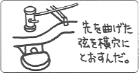 | 弦を切るのは穴に通す前でも,巻いた後でもいいんだけど, 切らないで先をブラブラさせているのは誉められないゾ。 危険でもあるし,次回弦をはずす時にも不便なので必ず切ろう。 穴に通す前に切る場合は,巻弦(4,5,6弦)は必ず折り曲げた先を切ること。 巻弦は不用意に切ると巻き線が緩んでしまうことがあるんだ。 |