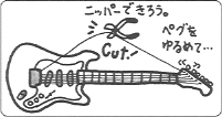 | 弦を切るのは穴に通す前でも,巻いた後でもいいんだけど, 切らないで先をブラブラさせているのは誉められないゾ。 危険でもあるし,次回弦をはずす時にも不便なので必ず切ろう。 穴に通す前に切る場合は,巻弦(4,5,6弦)は必ず折り曲げた先を切ること。 巻弦は不用意に切ると巻き線が緩んでしまうことがあるんだ。 |