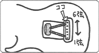 A新しい弦をブリッジに通す ストラト・タイプでは弦をボディの裏から通すので,ギターを裏返しに, テーブルの端に置いてトレモロ・ユニットの穴に弦を1本ずつ通す。 ギターが裏返しなので1弦側と6弦側が逆にならないように注意。 ギターを表向きに戻して,弦をブリッジになじませながら弦の先端をペグの方に引っ張る。 この時弦のボール・エンドがトレモロ・ユニットの穴の縁に引っかかったりしないように気を付けよう。 |